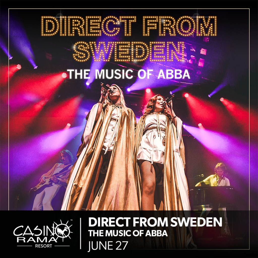 Direct from Sweden – The Music of ABBA, are no strangers to the incomparable sound and look of Sweden’s greatest music export with meticulous attention to costumes, make-up, musical arrangements, movements and the singing, nothing is left to chance. Adding a few of Abba’s live traits such as great solos, musical numbers and a complete live band with back-up singers, ensures an extra dimension unheard of in most similar productions. Direct from Sweden The Music of ABBA will deliver the closest ABBA experience you’ll ever get with some of Sweden’s most experienced and talented singers and musicians playing 100% live. Dance, sing along and enjoy the hits such as “Dancing Queen”, “Chiquitita”, “Waterloo”, “Mamma Mia,” and many more.